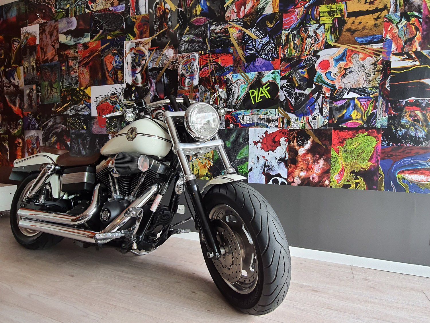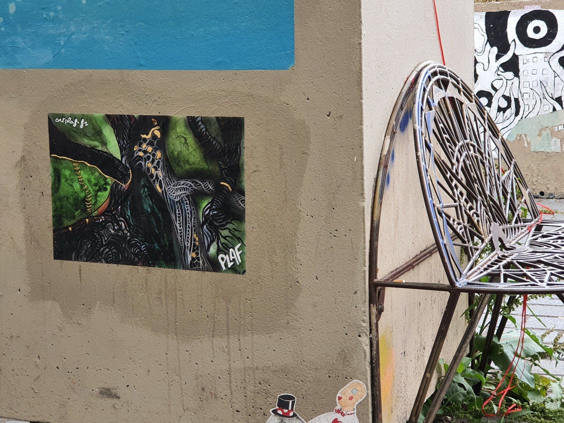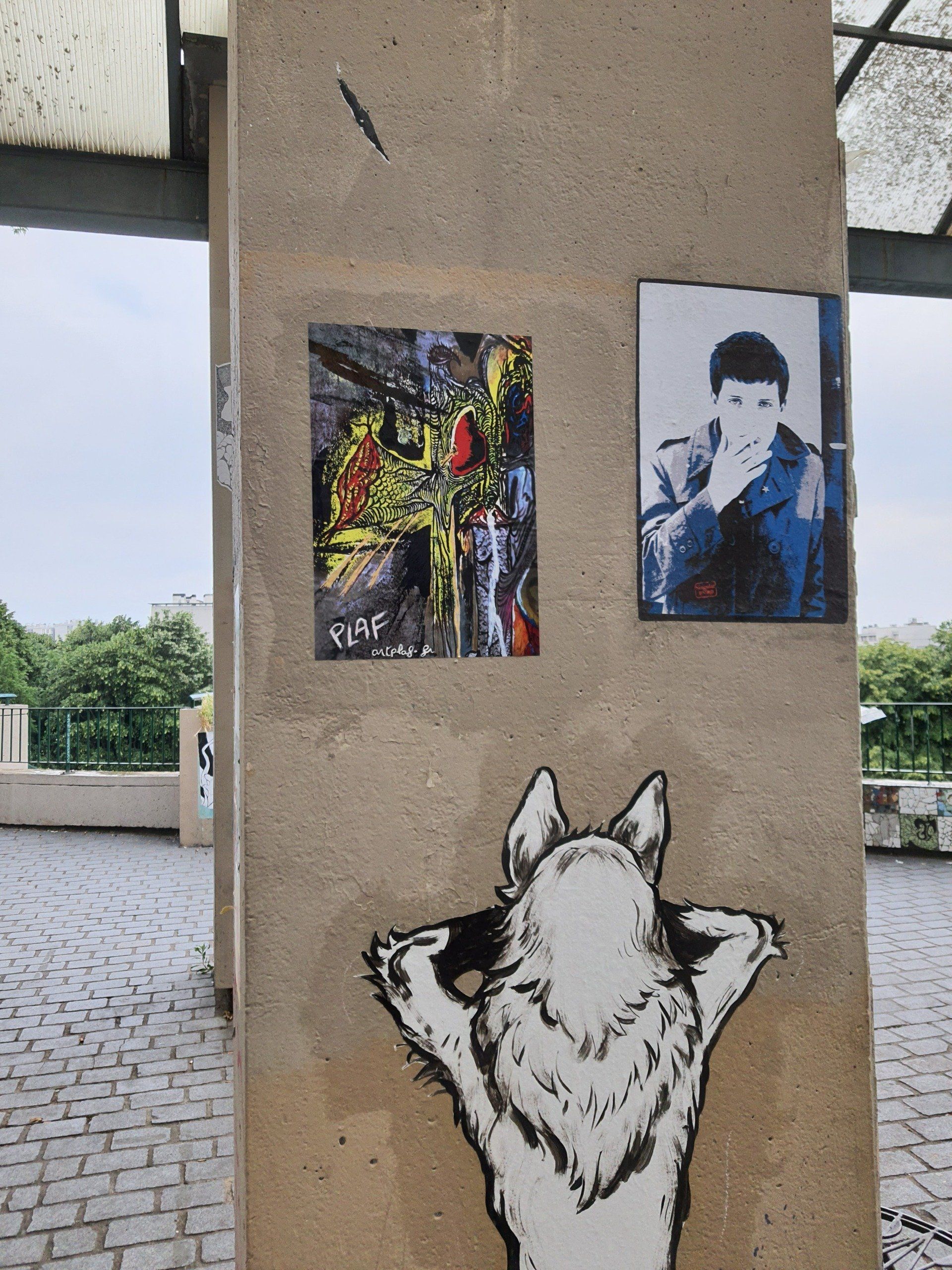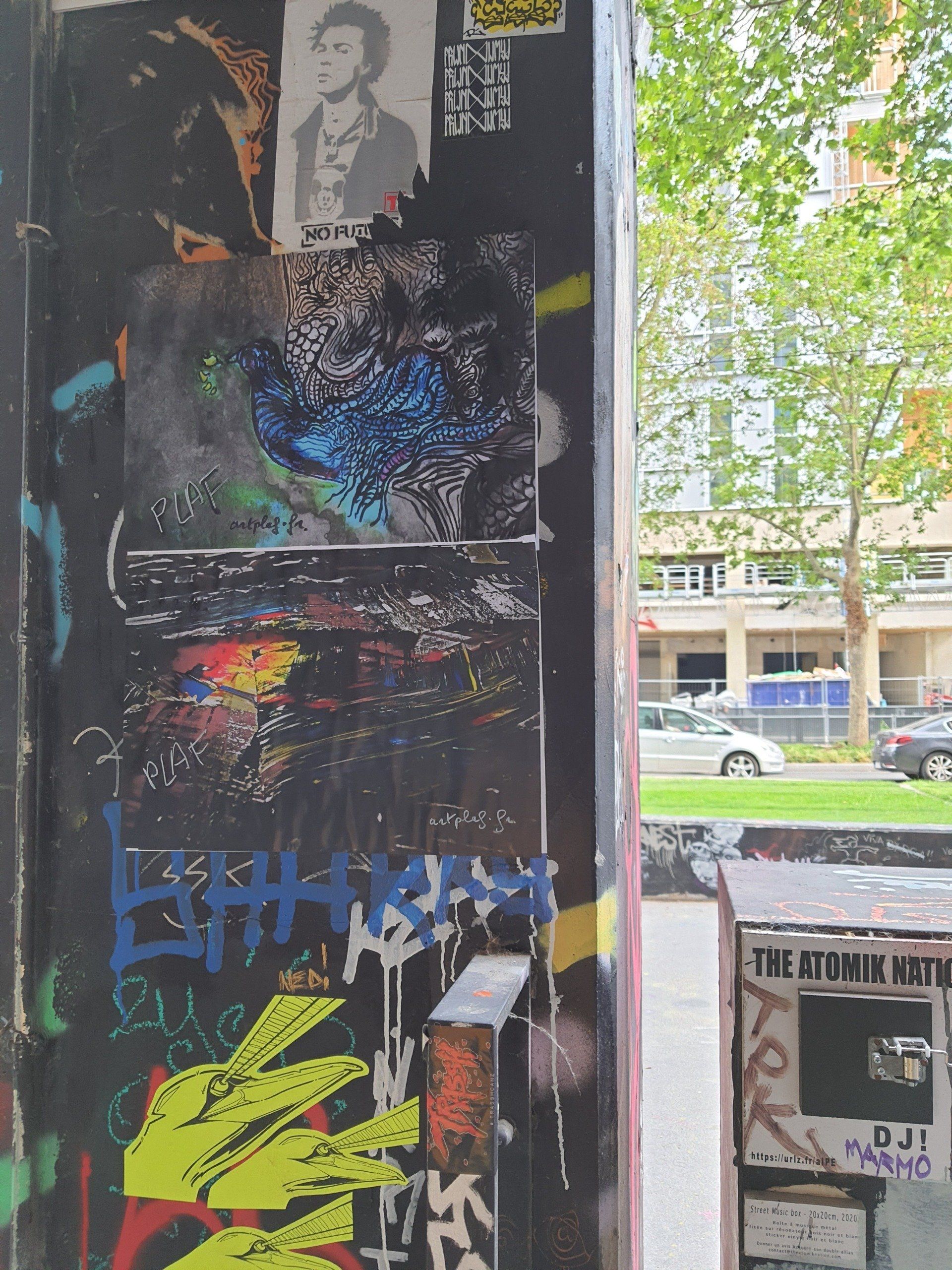 J’ai pu coller quelques tirages photographiques dans le grand escalier, sur le site de Spot13 (48 allée d’Ivry 75013). J’en ai profité pour coller aussi en haut du parc de Belleville. Ce sont ces collages qui m’ont permis de réaliser un patchwork de 8,5m2 pour le local d’une Harley Davidson