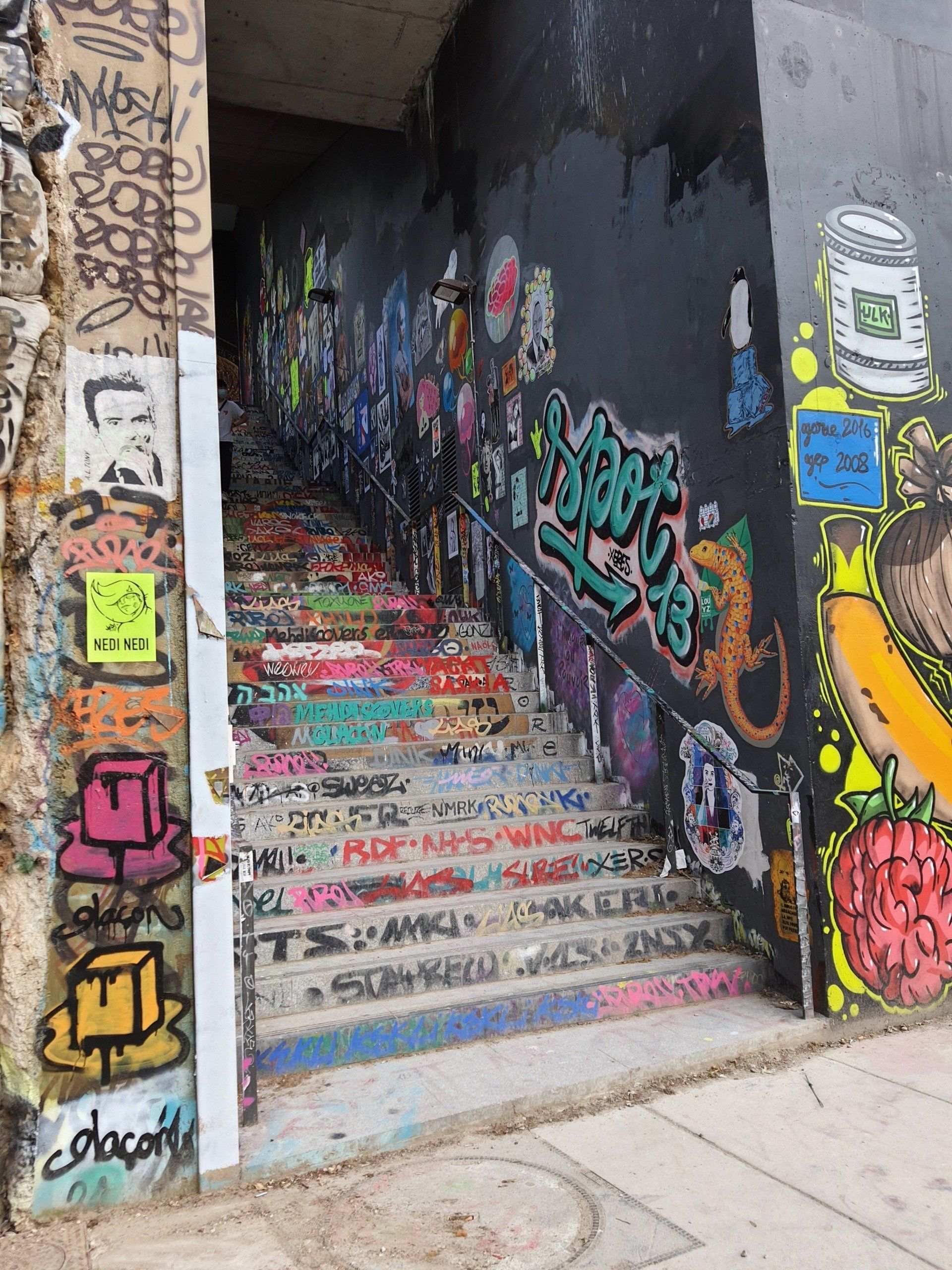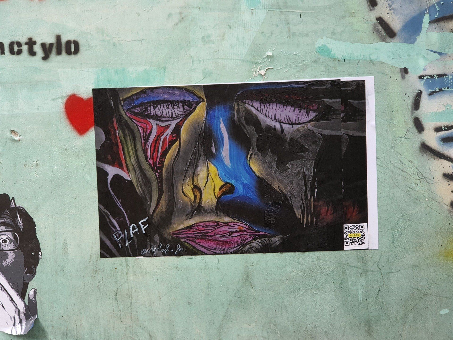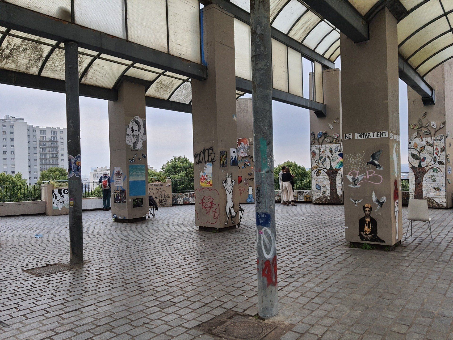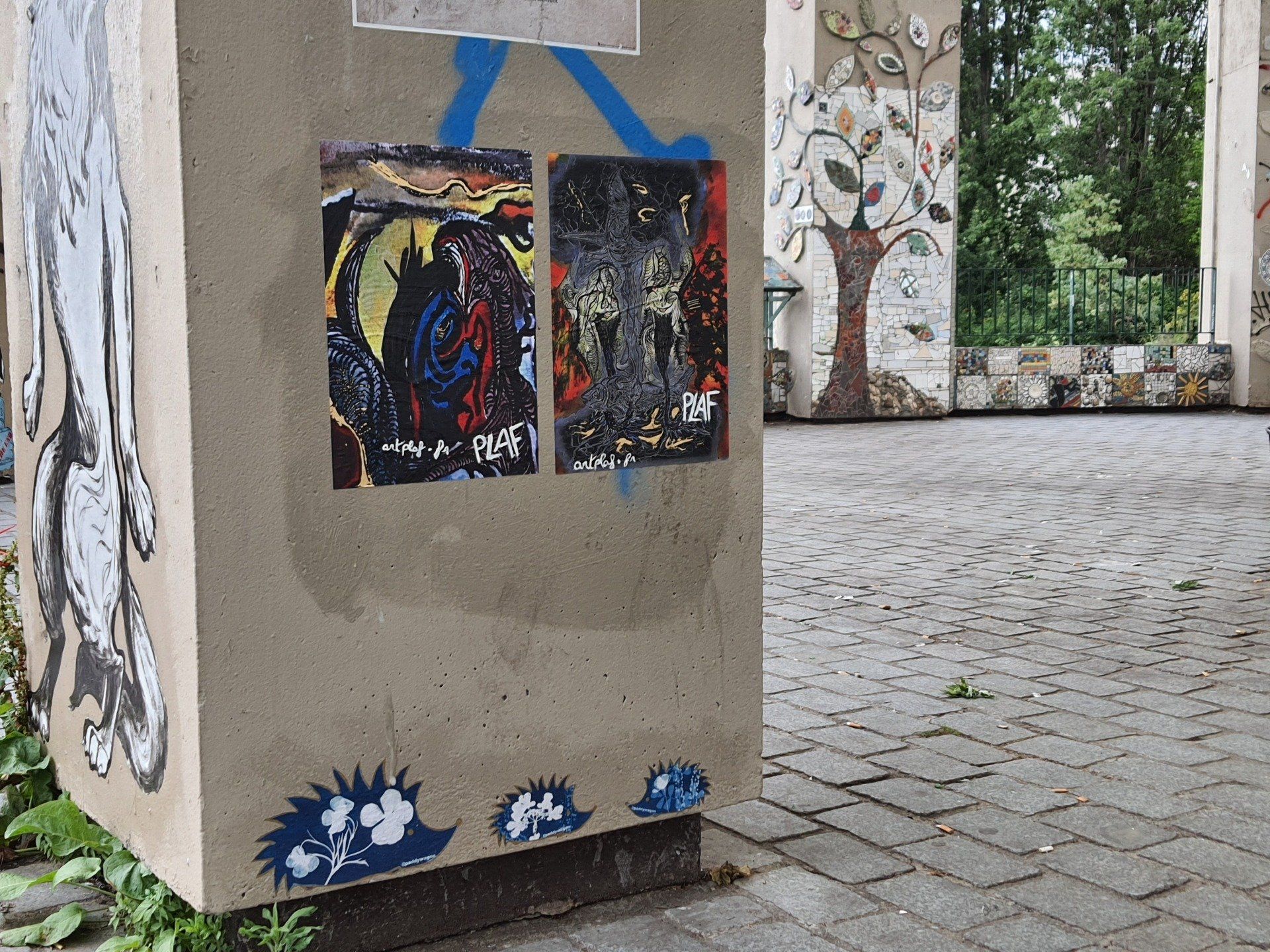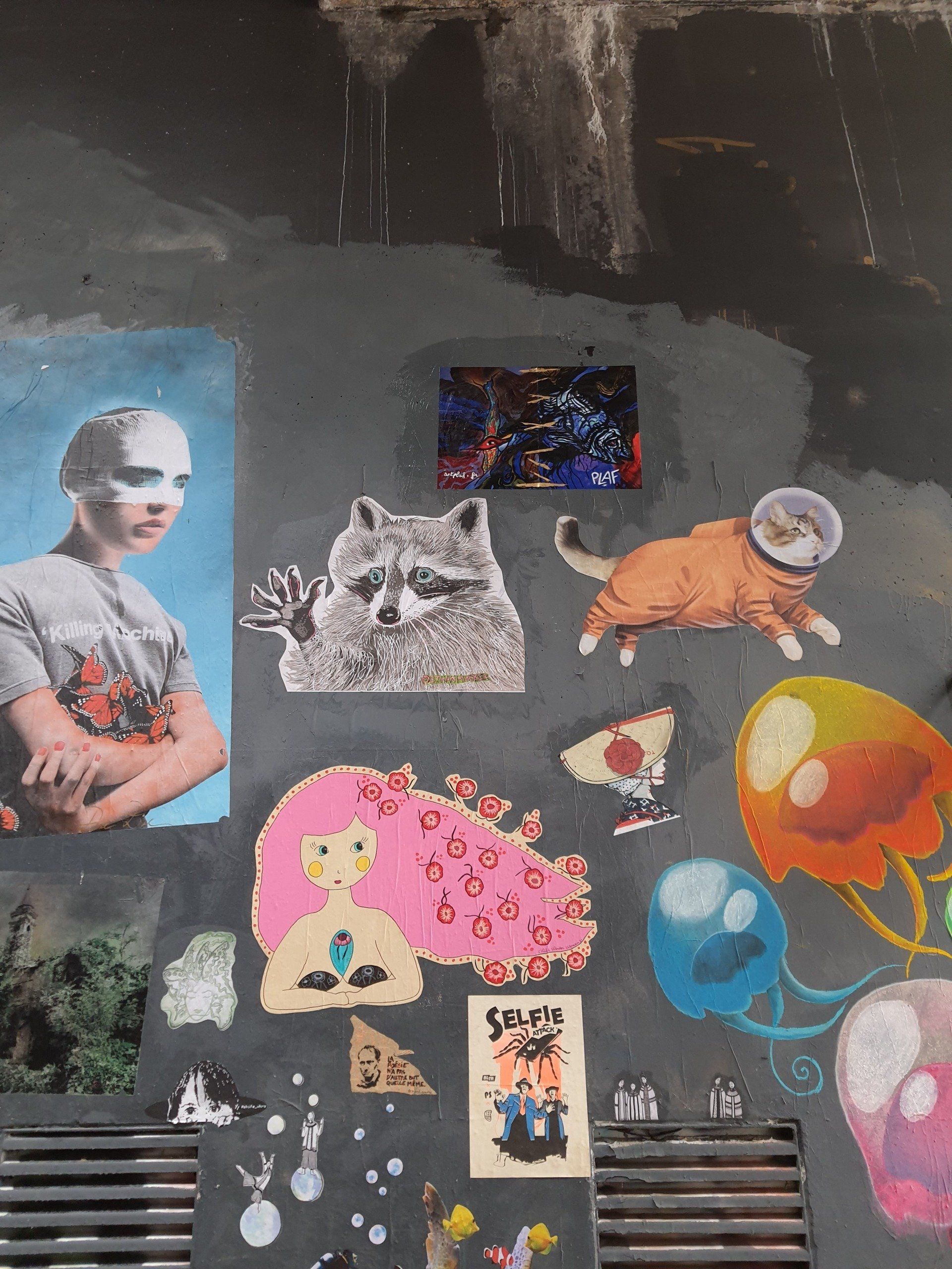 J’ai pu coller quelques tirages photographiques dans le grand escalier, sur le site de Spot13 (48 allée d’Ivry 75013). J’en ai profité pour coller aussi en haut du parc de Belleville. Ce sont ces collages qui m’ont permis de réaliser un patchwork de 8,5m2 pour le local d’une Harley Davidson